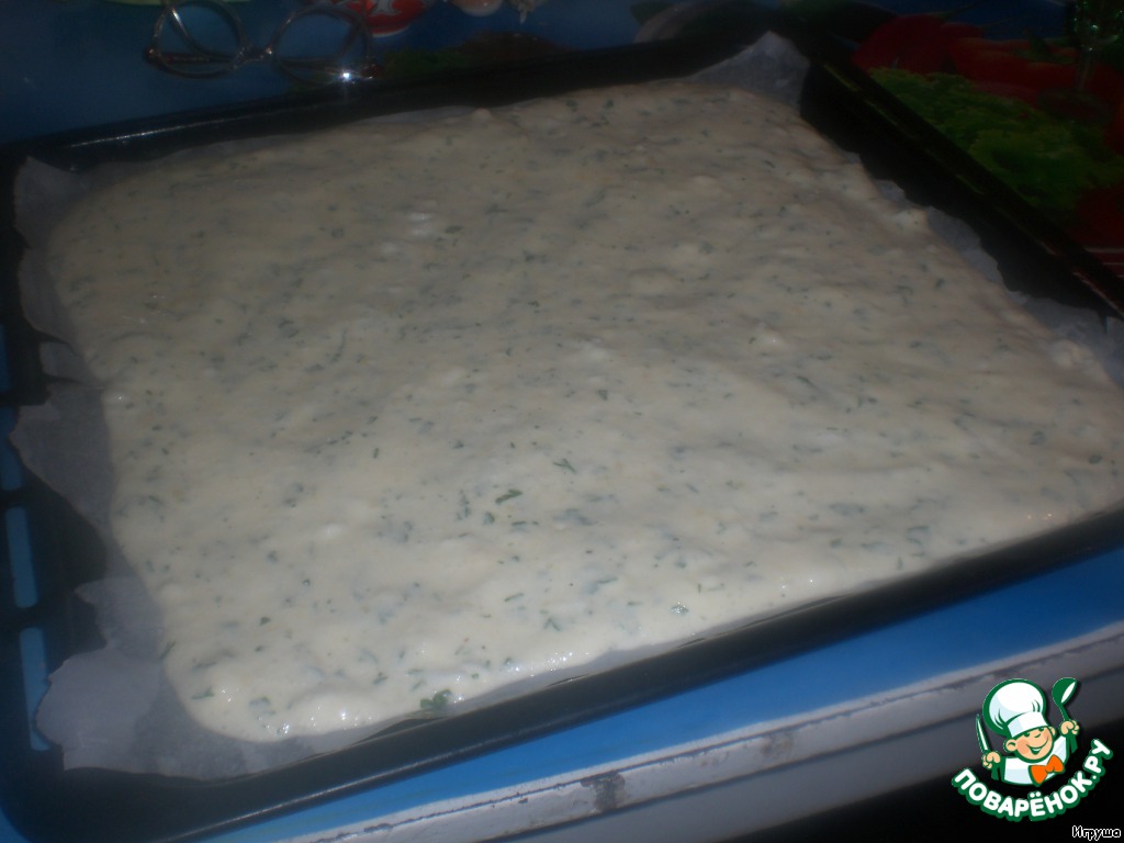 Тесто выкладываем на противень, покрытый пергаментом, смазанным маслом. Хорошо разравниваем.