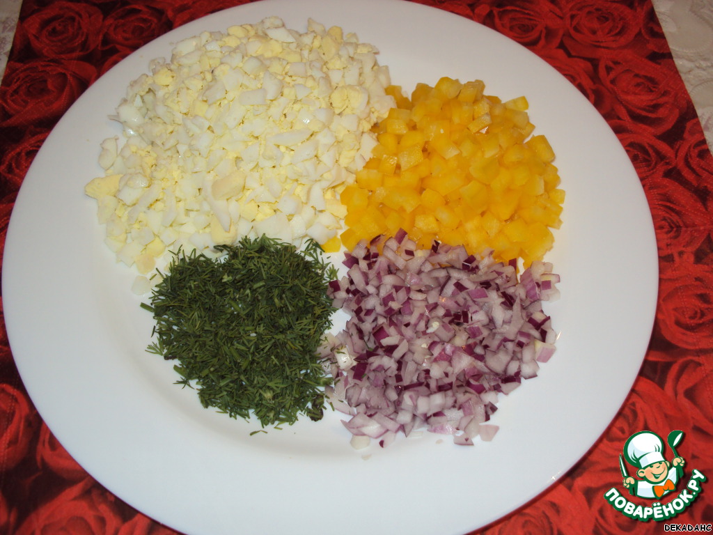 Лук, яйца, укроп, перчик мелко режем.