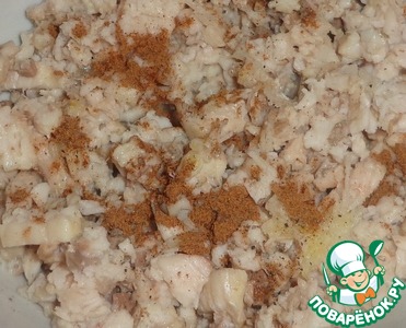 Рыбное филе порезать мелко или пропустить через мясорубку. Добавить измельченный чеснок, мускатный орех, соль и перец по вкусу. Специи можно добавлять в фарш любые, но чеснок обязательно. Перемешиваем.