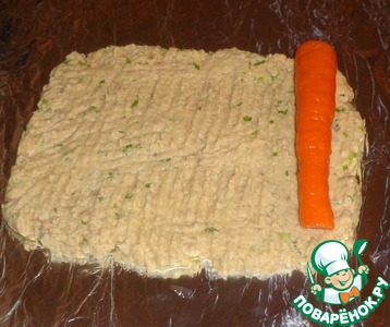 На фольге выкладываем из рыбного фарша прямоугольник. На один край кладем целую отварную морковь.