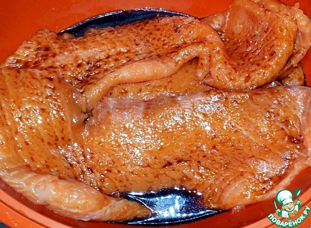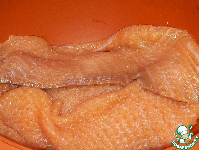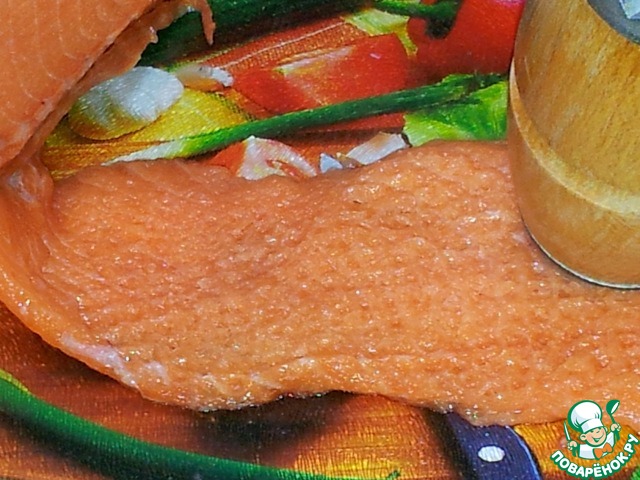 Немного разморозила филе лосося и разделила на 4 части, поперёк и вдоль. 2 части использовала для рулета. Пока полностью лосось не разморозился, обе части разрезала острым ножом вдоль на три части. Получилось 6 частей.