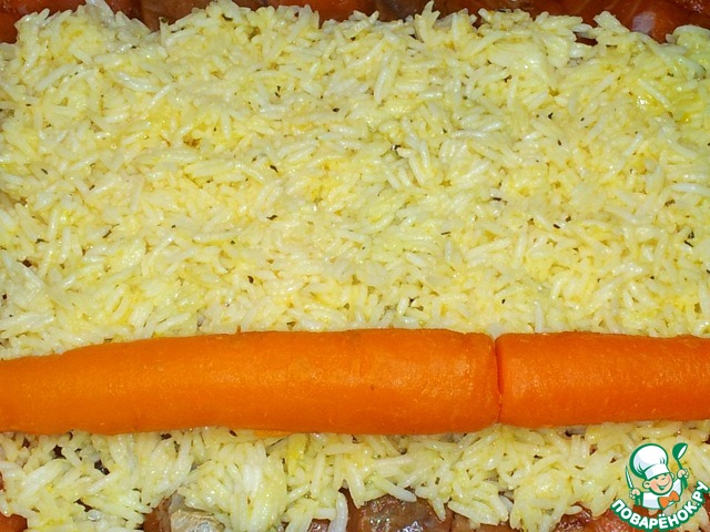 Лосось вертикально разложила на фольгу накладывая края один на другой. По всей поверхности лосося распределила рис. С нижнего края горизонтально положила вареную морковь.