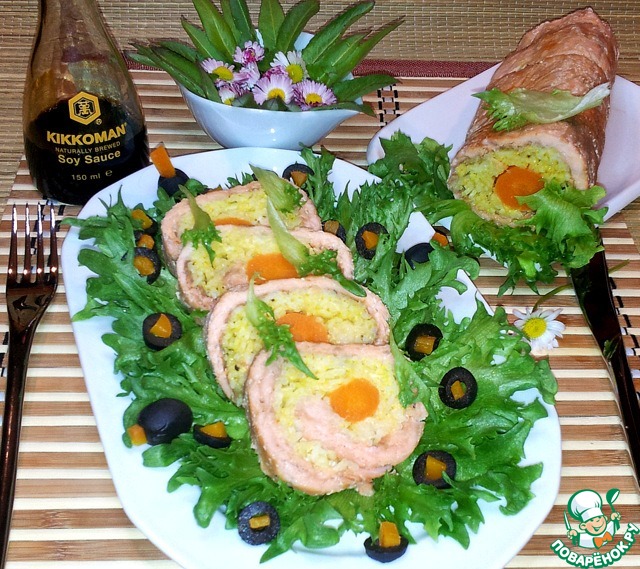 Для одной порции достаточно двух колец. К рулету из лосося подала оливки, которые начинила вареной морковью. Каждый заправлял рулет любимым соусом киккоман.
