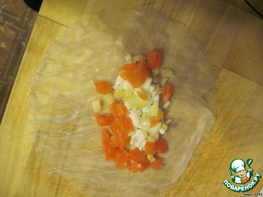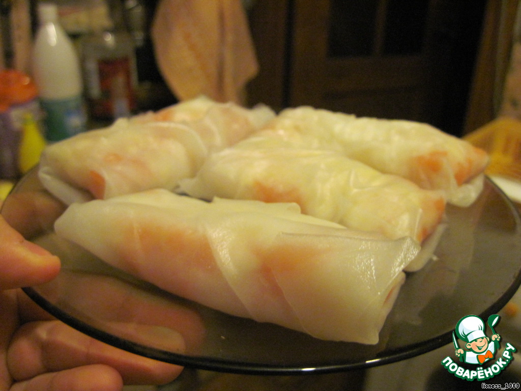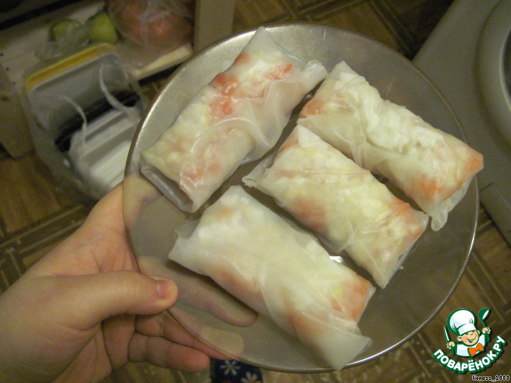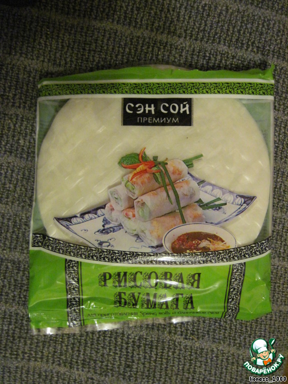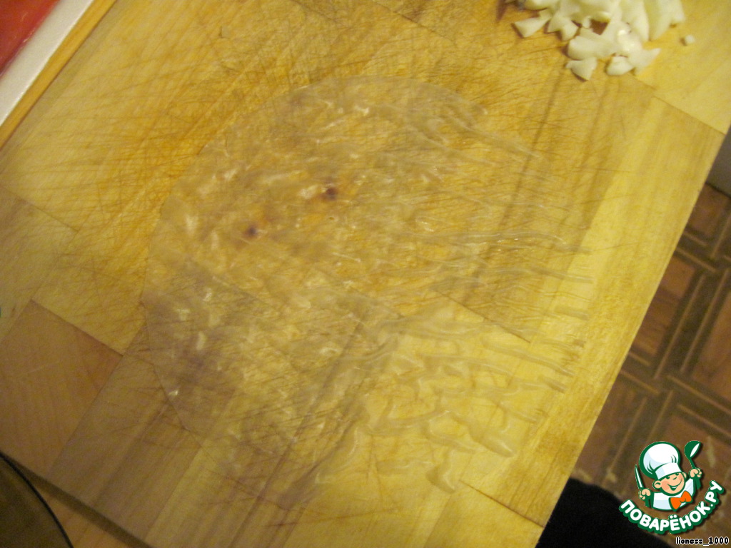 Рисовую бумагу аккуратно размочить в чистой кипеченой холодной воде. Только, чтобы она не развалилась и не порвалась, следите за ней, она должна размокнуть и стать тонкой, гладкой, тяжеловатой.