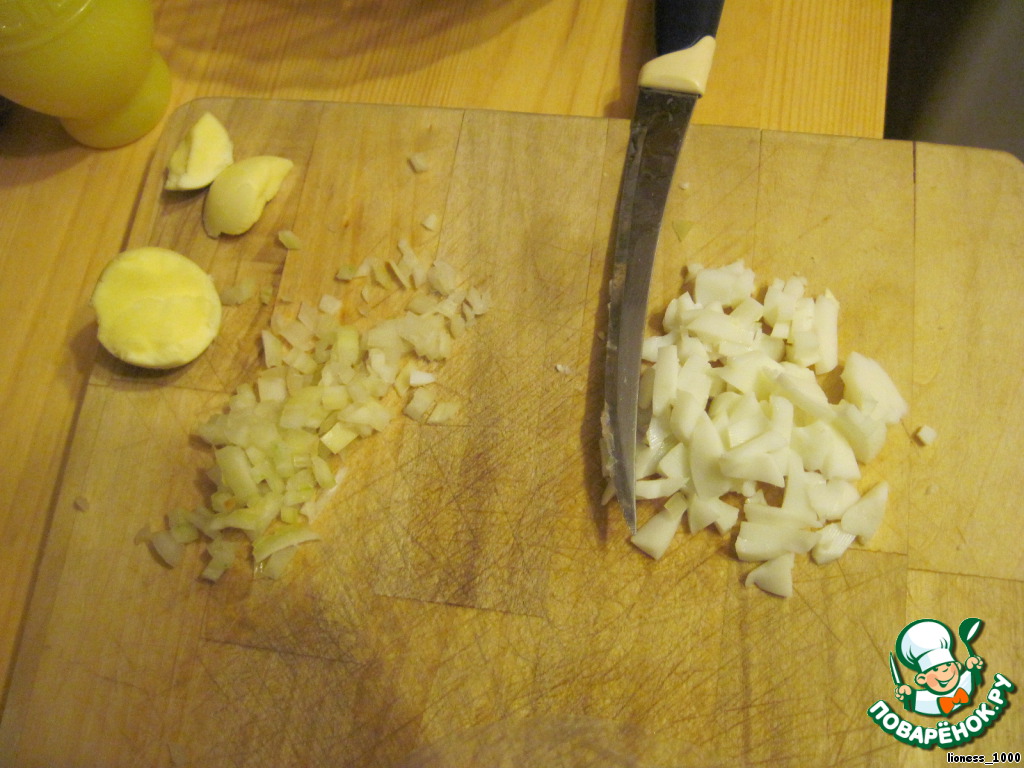 Сварите 2 яйца, нарежьте мелко. Лук тоже нужно мелко нарезать.