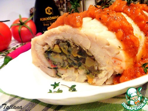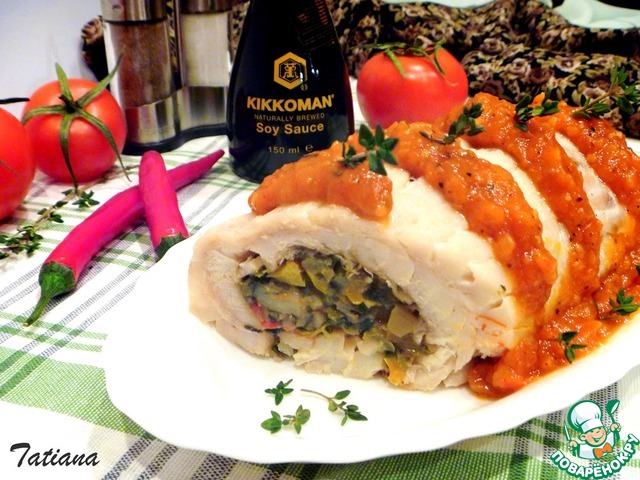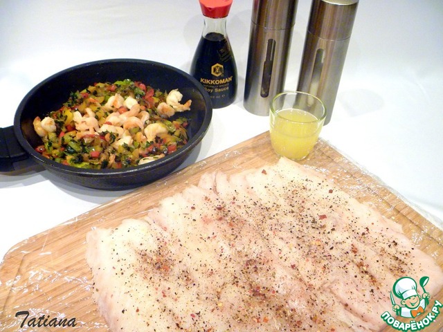 | Рыбный рулет из трески с острой, пикантной начинкой из креветок и ярких овощей, будет прекрасно смотреться на праздничном столе в постные дни. Особый вкус начинке придает соевый соус и мёд. |