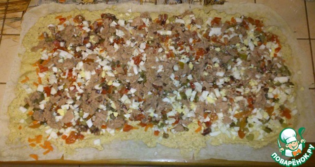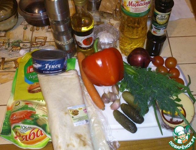 | Я уже выкладывал здесь свой рецепт салата с тунцом и маринованным луком. Но сегодня решил изменить "форм-фактор" и начинку. Получилось крайне необычно. Все дело в соусе. В него я решил добавить колбасный сыр, что придало соусу копченый привкус. Очень вкусный рулетик, доложу я Вам -)) Да, забыл сказать, это мой первый опыт в "Рулетостроении", поэтому прошу сильно не пинать-) |