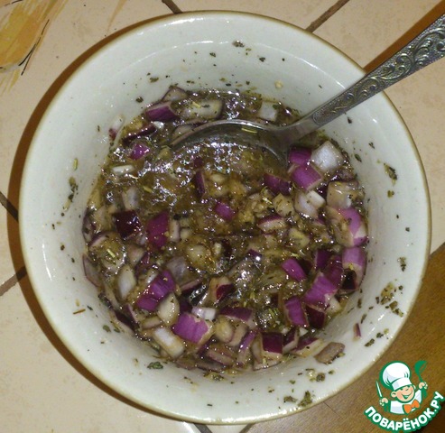Сначала замаринуем красный лук. Для этого смешаем соевый соус, рисовый уксус и подсолнечное (оливковое) масло. Добавляем соль, смесь перцев, базилик и травы. Солим. Закладываем мелко резаный лук, перемешиваем и ставим на пол часа в холодильник.