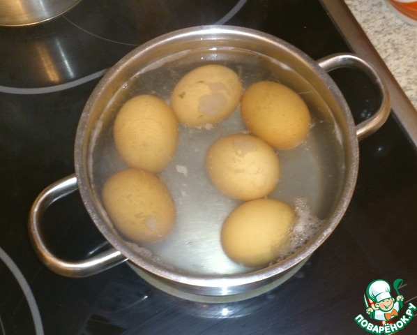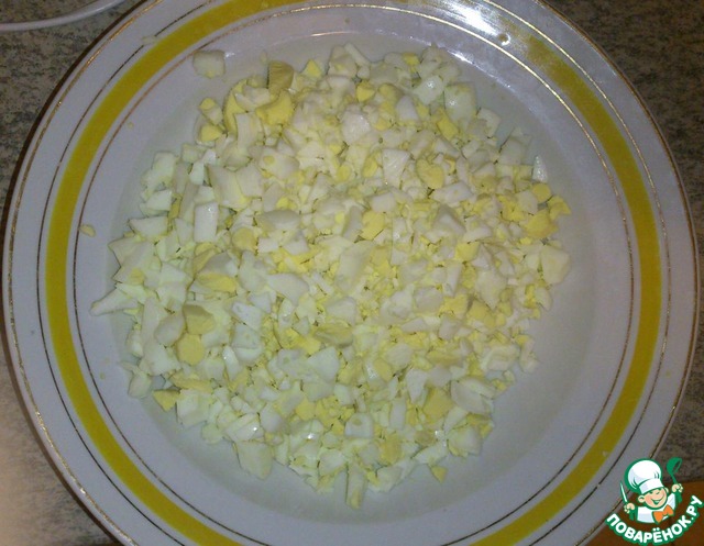 Сваренные яйца остужаем, чистим и мелко режем. Я немного присолил