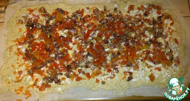 Теперь перец с помидорами. Достаем из холодильника маринованный лук и выкладываем сверху равномерно по лавашу