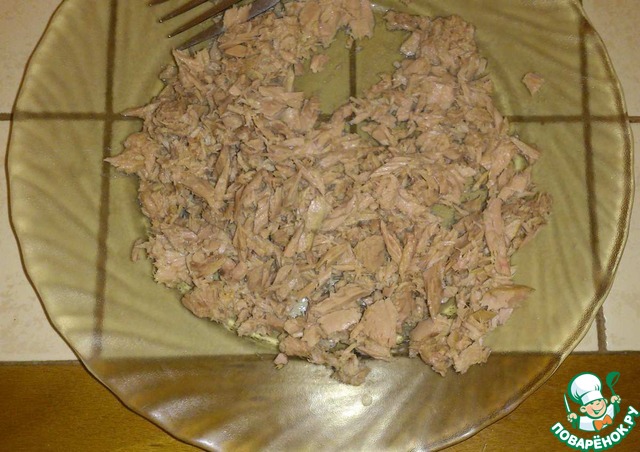 Из банки с тунцом сливаем сок, выкладываем на тарелку и разбираем тунца на волокна