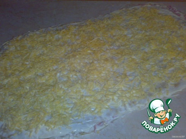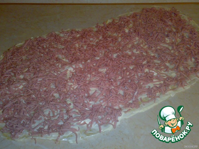 Сверху натираем на крупной терке вареную колбасу.
