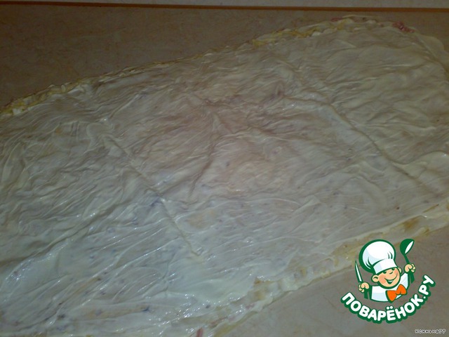 Затем кладем третий лист лаваша и снова намазываем чесночным майонезом