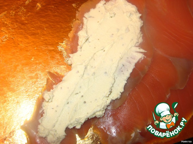 Каждый кусочек рыбы смазать творожным крем-сыром.