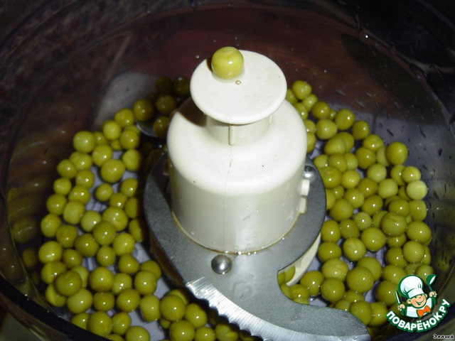 Зеленый горошек измельчаем в блендере, солим и перчим