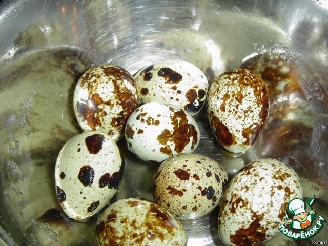 Отвариваем перепелиные яйца, очищаем.