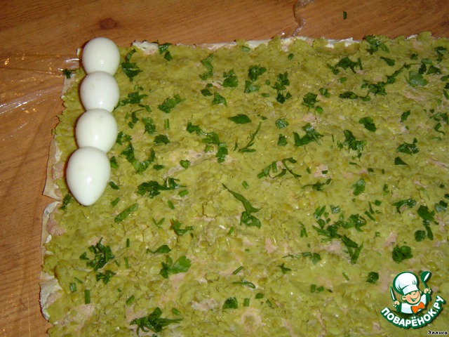 Измельчаем петрушку, кинзу и посыпаем зеленый горошек. На один край выкладываем яйца и сворачиваем лаваш в рулет. Убираем в холодильник на 30 минут.