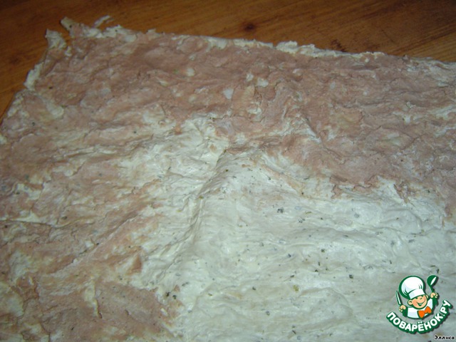 На творожный сыр намазываем готовый паштет.
