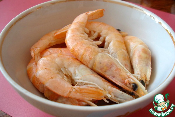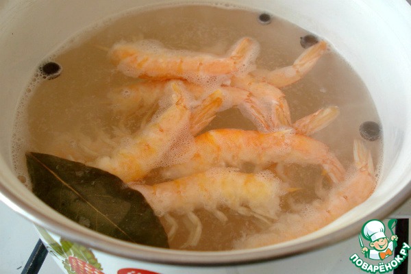 Отвариваем креветки в подсолёной воде с добавлением перца горошка 5шт и лаврового листа 1шт 2-3минуты.