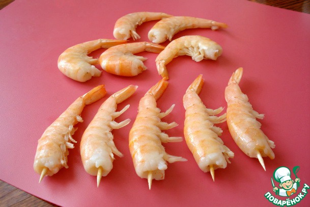 Удаляем головы, а в хвостики вставляем зубочистку (как на фото), чтобы хвостики после того как мы их отварим, были ровными.