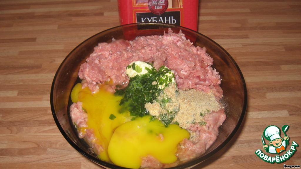 В фарш добавить хлеб, вымоченный в молоке, 2 яйца, масло, зелень, сухари.