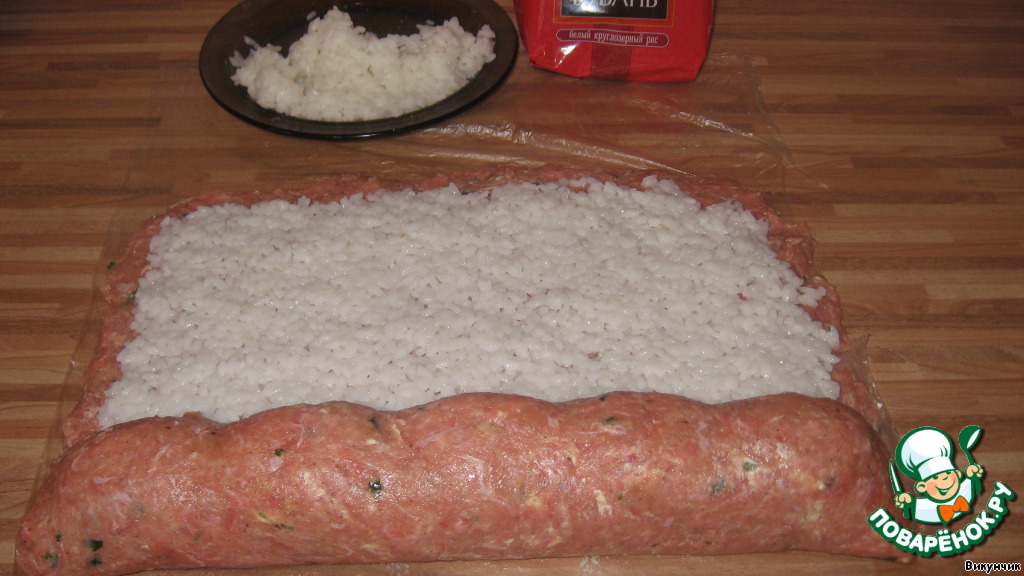 Полученный фарш выложить пластом толщиной 1,5 см на влажную марлю или пакет. Выложить приготовленные яйца в ряд. Осторожно подтягивая пакет с одной стороны, раз сворачиваем и выкладываем отварной рис и сворачиваем пласт фарша с начинкой в форме рулета.