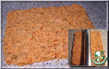 Половину желатиновой массы (еще теплой) влить в рыбный фарш, хорошенько перемешать. Выложить рыбный фарш на пищевую пленку. Толщина слоя примерно 1,5 см.