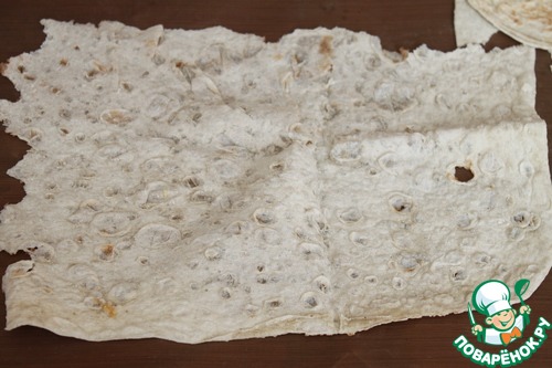 Лаваш нарезать (или разорвать руками) на две части поменьше, чтобы было удобнее сворачивать и есть.