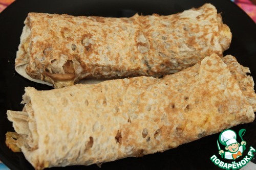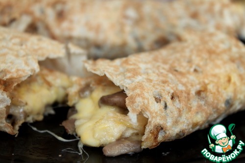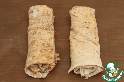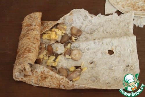 Свернуть рулетом, загнув торцевые края внутрь, чтобы не вытек сыр.
