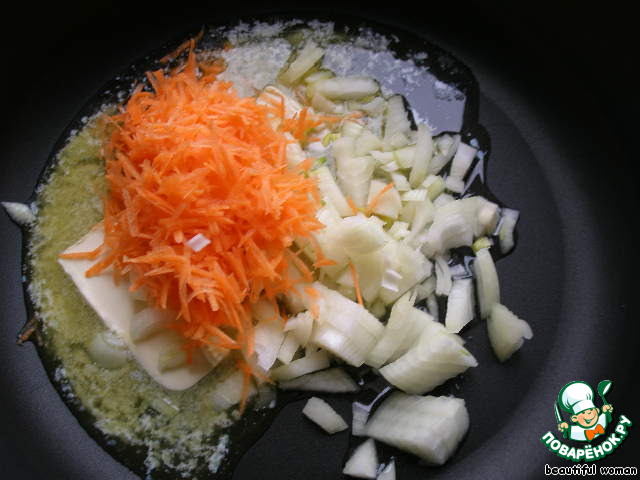 Растопим в сковороде сливочное и растительное масло, выкладываем в сковороду нарезанную луковицу и тертую морковь. Обжарим