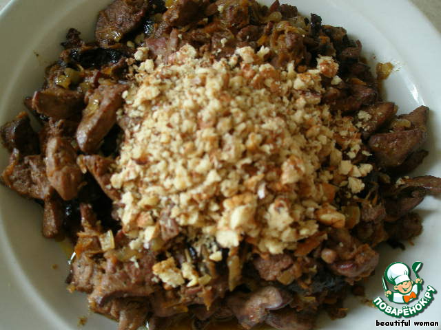 К луку и моркови добавляем нарезанные соломкой печень и чернослив. Обжарим 7 минут, постоянно помешивая. Не пережарить!