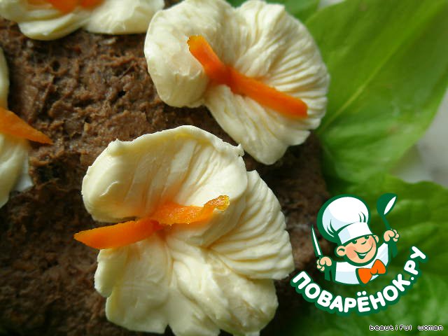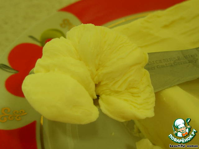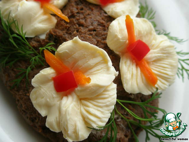 Выкладываем на тарелочку, украшаем цветами из сливочного масла и подаем к столу.