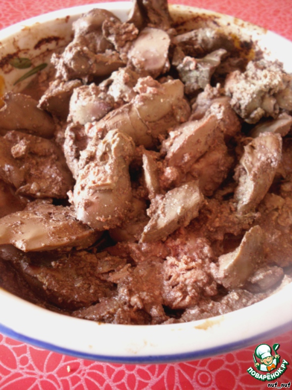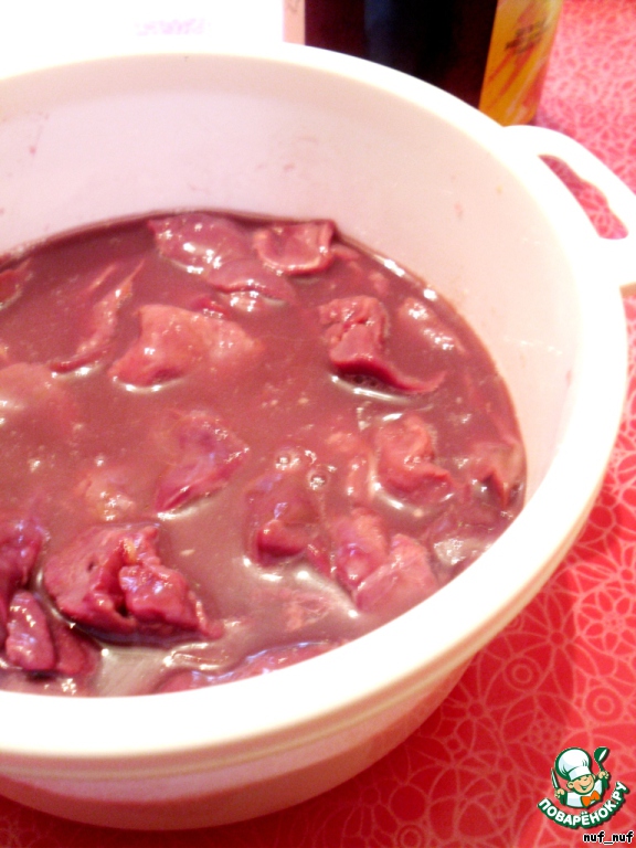 Затем слить весь маринад, выложить печень в керамическую форму и поставить запекаться в только что включённую духовку, довести температуру до 10-120 градусов и при этой температуре запекать печень 12-15 минут.