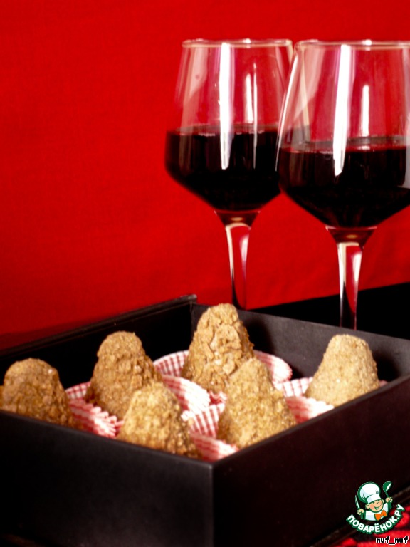 Ржаные хлебцы (Finn Crisp) измельчить в процессоре до состояния крошек и смешать (по желанию) с сухим чесноком. Обвалять "конфетки" в полученных крошках.
