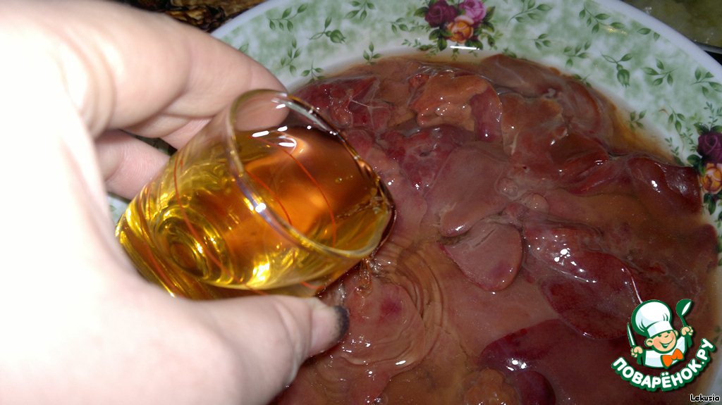 Добавить печень, припорошить мукой, во время жарки добавить 50 мл вина. Довести до готовности.