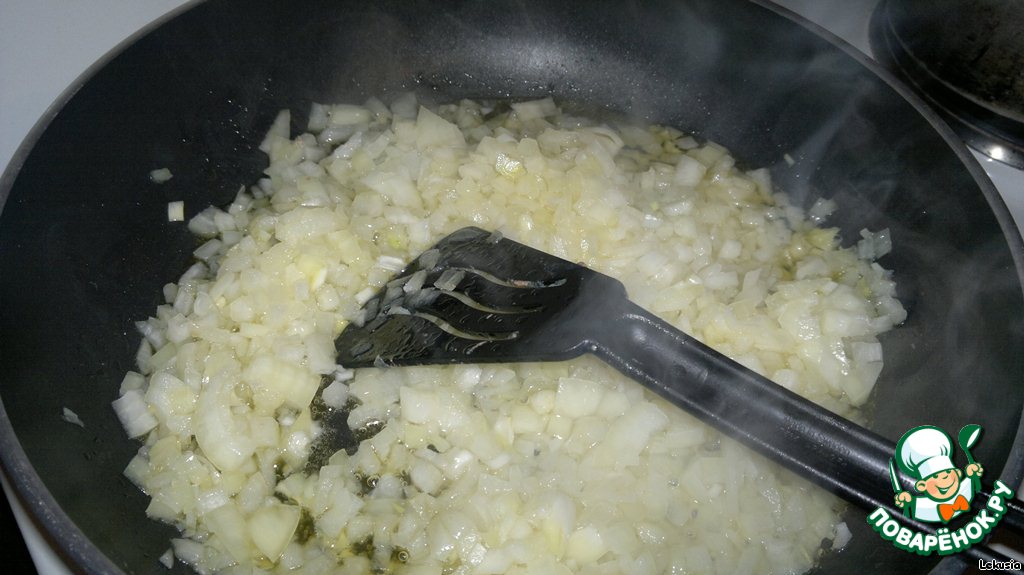 Нарезать мелко лук (2 головки) и чуть позолотить его в масле.