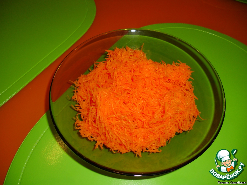Морковь натереть на мелкой терке. Желатин замочить в стакане холодной воды на 10 минут, затем нагреть, постоянно помешивая.