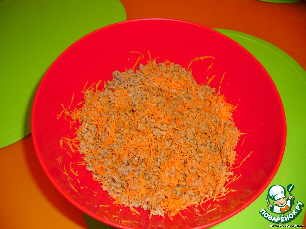 Печенку смешать с морковью, добавить половину желатина и перемешать.