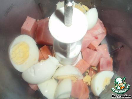 Дальше готовим ветчинный паштет. Для этого берем ветчину и вареные яйца, измельчаем в блендере (или пропускаем через мясорубку), добавляем 1 стак. вина, горчицу, бульон, сливки (о.5 ст).