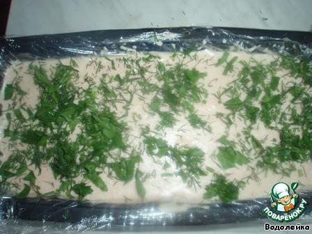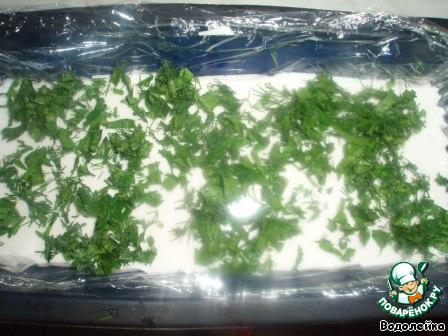 Достаем форму, берем оставшуюся нарезанную зелень и посыпаем ею застывший ветчинный слой.