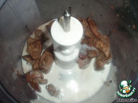 Теперь готовим печеночный паштет. Печень обжарить и измельчить в блендере (или через мясорубку) + 3 ст.л. вина + 2 стак. сливок. Пробуем на соль и перец, при надобности - приправить.