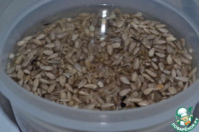 Не жареные семечки высыпать в просторную емкость и залить на ночь водой.