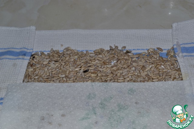 Простелить полотенце, выложить тонким слоем семечки и сверху накрыть еще одним полотенцем (чтобы ушла вся лишняя влага).