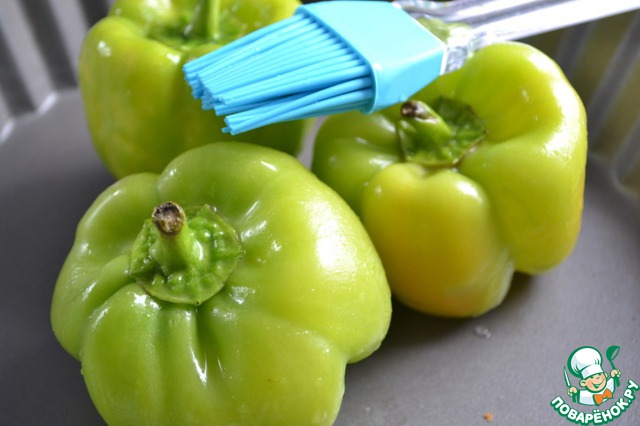 Перец смазать растительным маслом и запечь в духовке (при t=180-200 градусов) до мягкости (один перец у меня стал мягким через 25 мин, а двум другим потребовалось около 35 мин.). Так что ориентируетесь по своей духовке. Затем сложить перец в пакет и завязать плотно на 10-15 мин. После очистить его от семян и кожицы (хотя можно кожицу и не убирать).