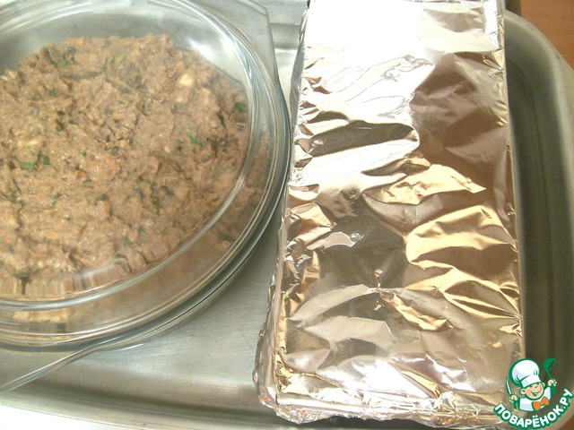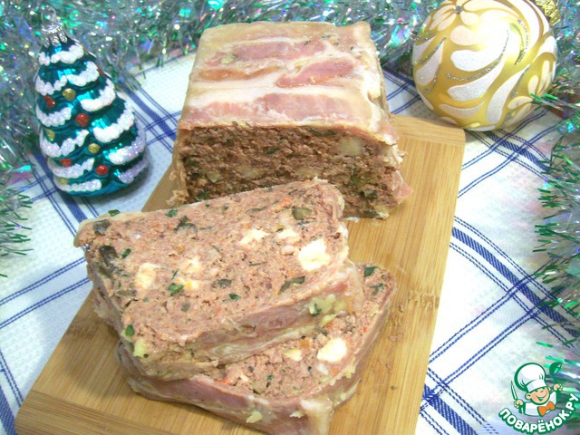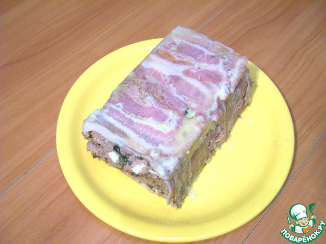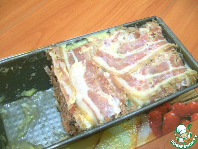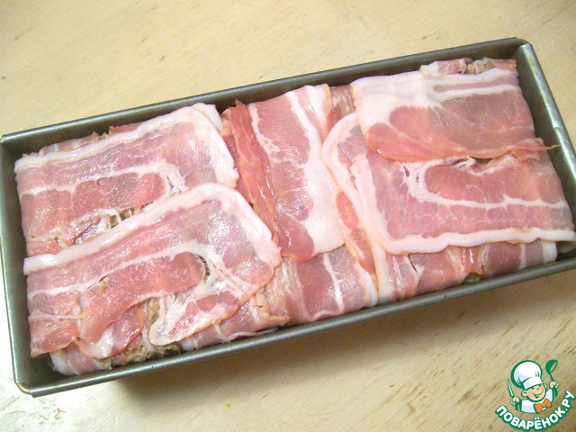 Теперь берем форму, в которой будем запекать террин. У меня прямоугольная. Чуть смажем ее растительным маслом, выстилаем дно и бока полосками бекона так, чтобы они свешивались наружу и мы могли бы впоследствии ими сверху закрыть наш террин. Выкладываем плотненько фарш в форму, закрываем сверху полосками бекона. Должно получиться примерно вот так.