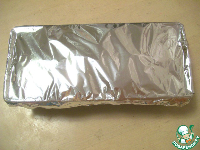 Я готовность определяла по стеклянной форме. Когда террин в ней слегка зазолотился, я выключила духовку. Далее нужно извлечь форму с террином из духовки. Остужала я террин для праздничного стола (который в беконе, с фольгой) под прессом, чтобы он был более плотный и его удобно было бы резать. Положила прямо сверху на форму, на фольгу стеклянную разделочную доску, а на доску - банку с водой. Так как форма эта у меня была заполнена до верху, террин в ней прижался очень хорошо. Остужала на балконе (температура была минус 3 градуса).