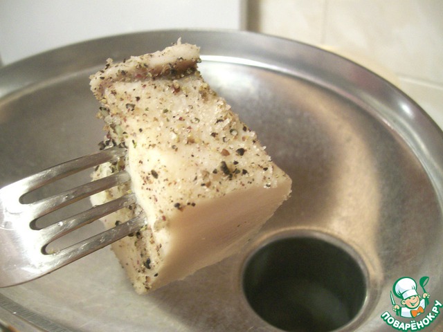 Затем кусочек сала (для сочности будущего террина). Для тех, кто принципиально сало не ест, можете этот шаг пропустить.