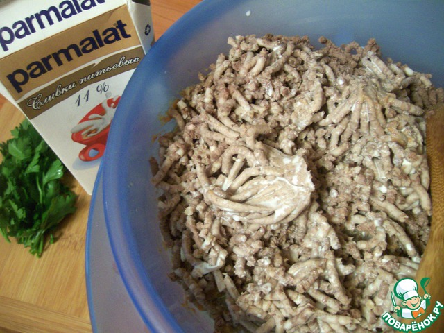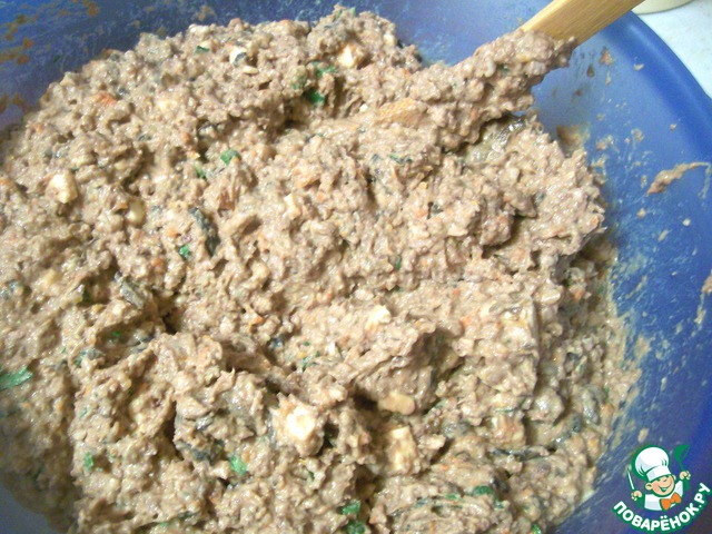 Тщательно все перемешиваем. Я соли больше не добавляла, так как соленость дают соевый соус и копченый сыр, да и печенку с сердцем мы присаливали, но вы, если любите посолонее, добавьте еще соли.