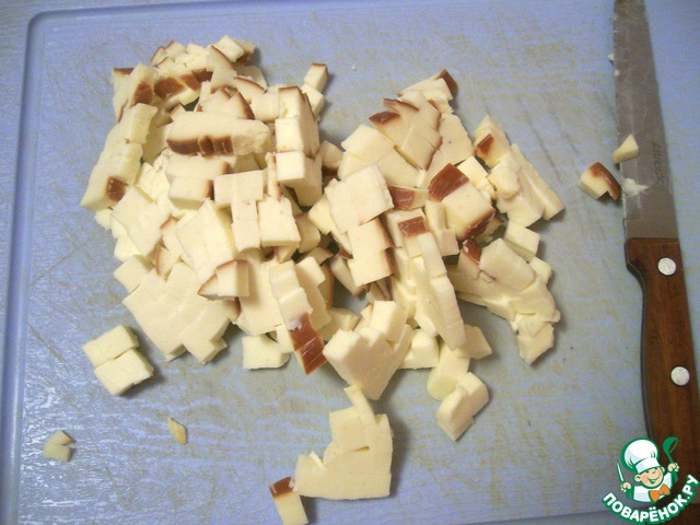 Затем мелкими кубиками режем колбасный сыр, добавляем его в фарш.