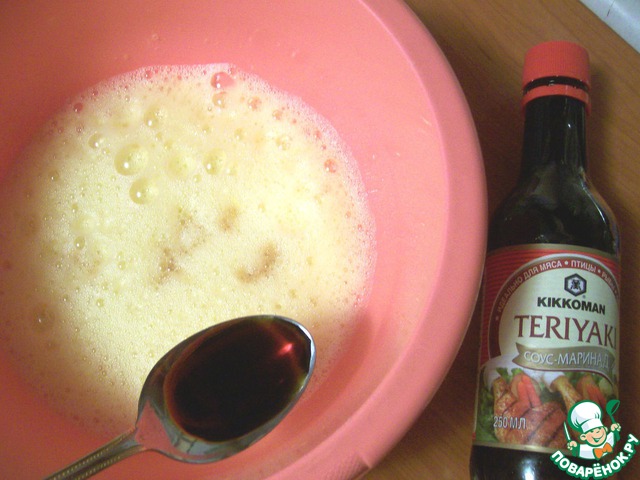 Взбиваем яичко, добавляем в него соевый соус "Kikkoman", перемешиваем и добавляем в фарш.